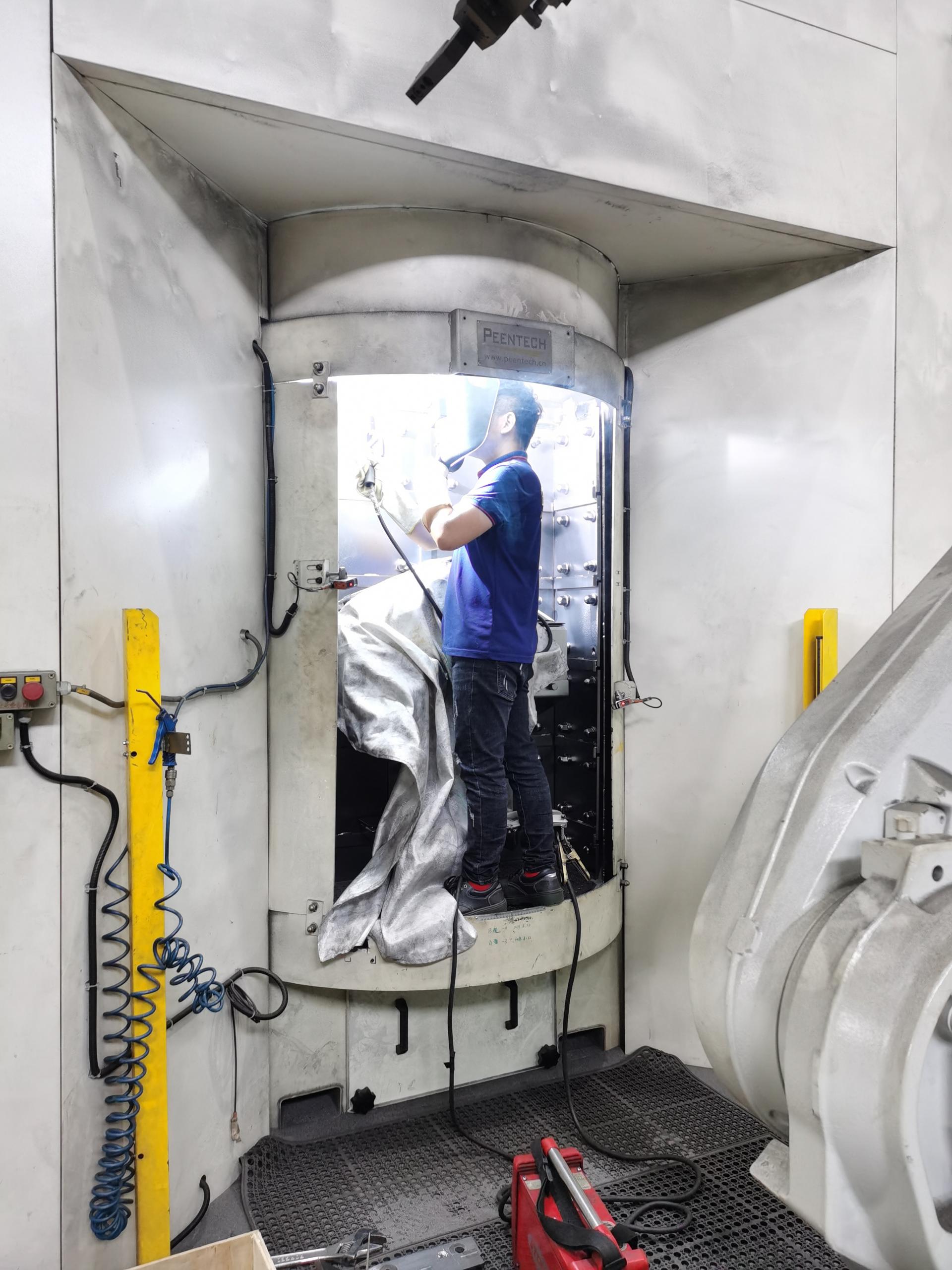 近期,我司接到本特勒嘉定工廠設備維護人員急切電話,貴司能否解決一臺拋丸機局部護板壽命問題,我司立即指派專業技術人員到現場查看,詢問得知,局部護板為拋頭直射位置,并且距離很近,原廠家采用Mn13材質護板,以及Cr12MoV材料制作并熱處理,但使用壽命僅為30-40小時,用戶非常不滿意,大大增加設備維護工作量。用戶要求將護板壽命提高10倍,即為300-400小時。我司技術人員結合多年的設計、實踐經驗,判定此處必須采用鎢鋼(硬質合金)材質護板,才能達到用戶壽命指標。