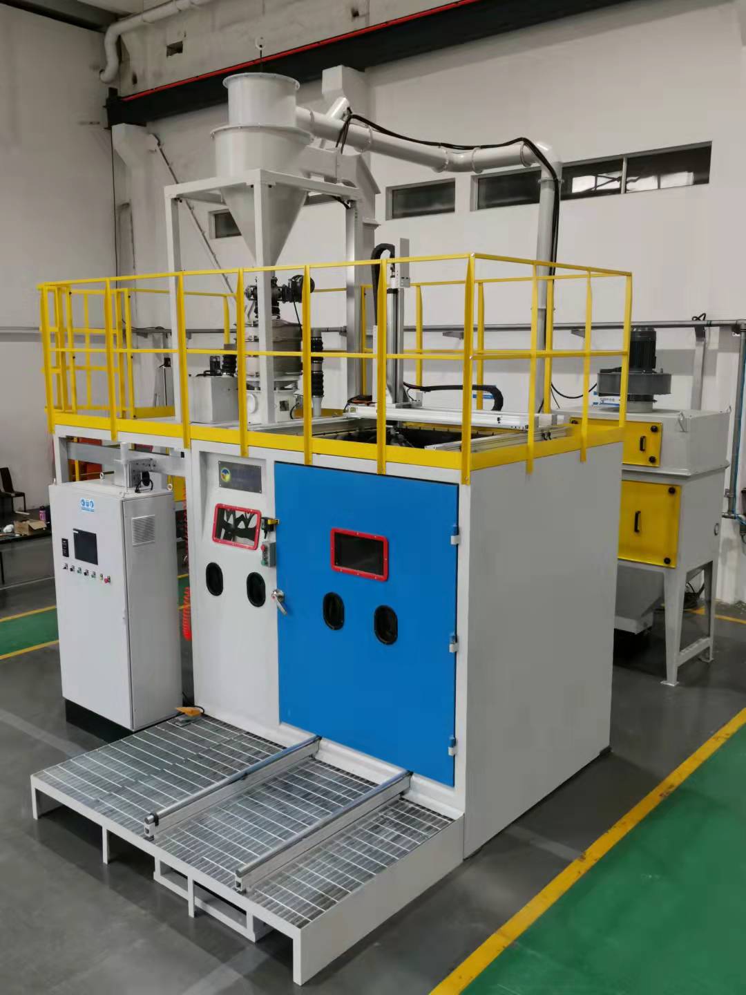 6)丸料存儲單元采用2套料倉,分別儲存500KG鋼絲切丸和白剛玉,2套自動加料斗實現丸料的閉環控制。